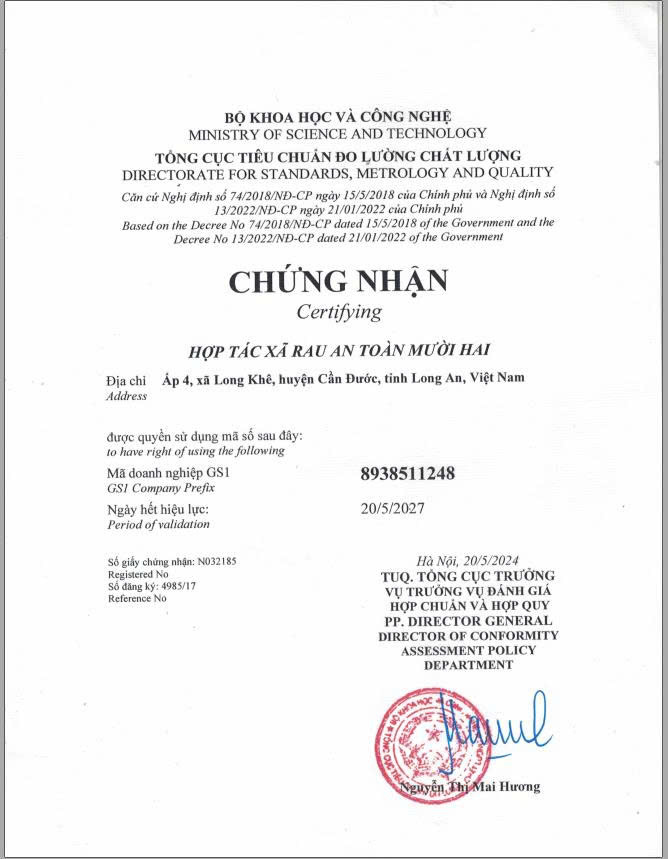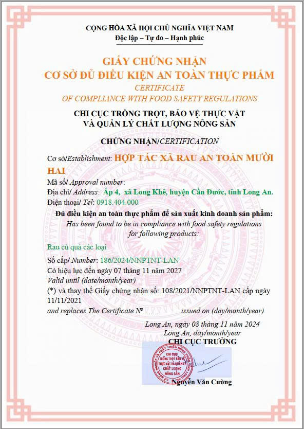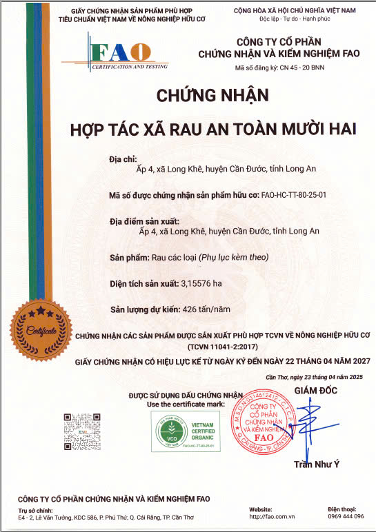 HTX RAU AN TOÀN MƯỜI HAI hiện là 1 trong 3 HTX điểm ứng dụng công nghệ cao trong sản xuất nông nghiệp của tỉnh Long An Với hệ thống nhà lưới, tưới tự động của HTX được đầu tư bài bản, chi phí phù hợp với nông dân. HTX có 25 xã viên, sản xuất khoảng 10 loại rau ăn lá với diện tích 8,1ha. Hầu hết xã viên đều trồng rau trong nhà lưới, thực hiện quy trình bán hữu cơ, sử dụng phân sinh học